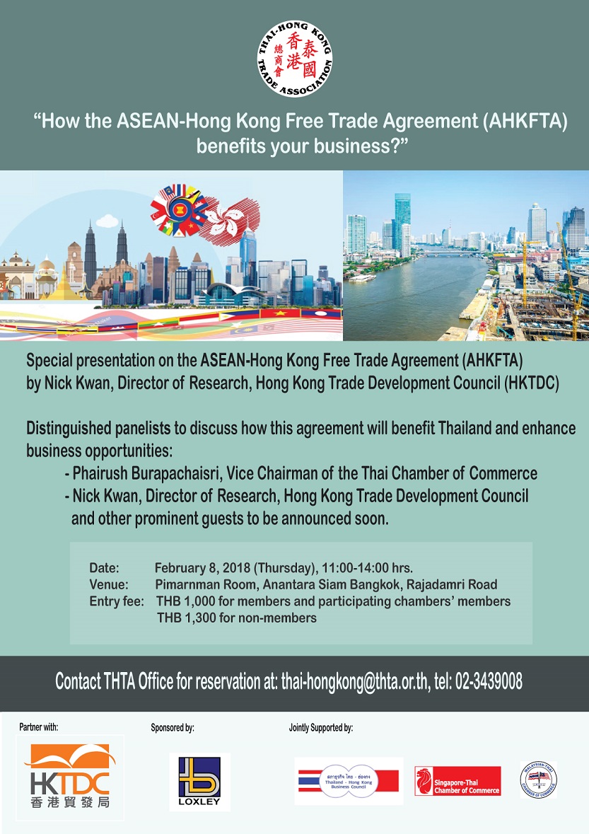 The Thai-Hong Kong Trade Association (THTA) in collaboration with the Hong Kong Trade Development Council (HKTDC), and supported by Thai-Hong Kong Business Council, Singapore-Thai Chamber of Commerce and Malaysian-Thai Chamber of Commerce, proudly present a Business Luncheon on “How the ASEAN-Hong Kong Free Trade Agreement (AHKFTA) benefits your business?”on February 8, 2018.