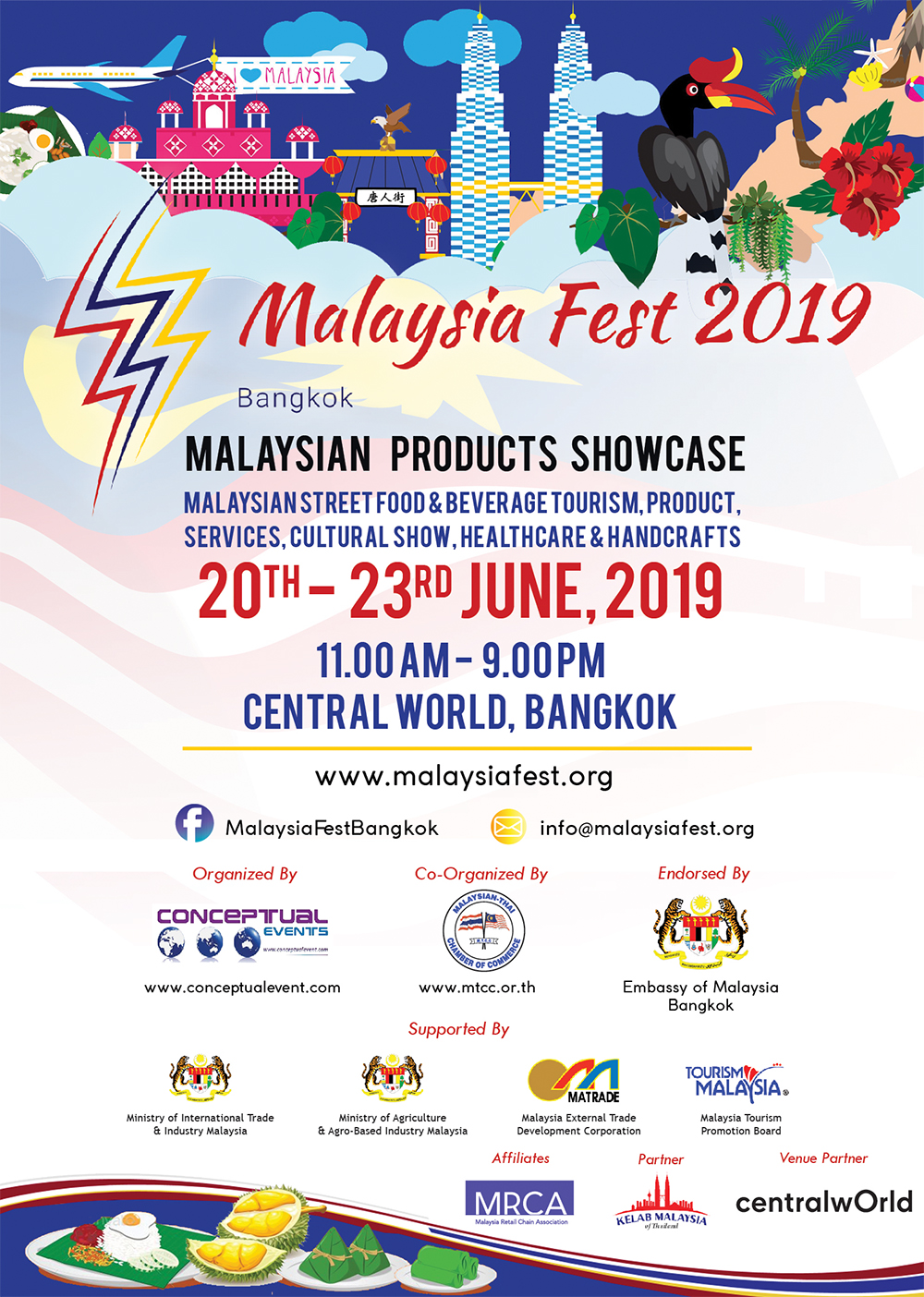 We are pleased to inform that MTCC will be supporting Conceptual Events Worldwide Co. Limited in organizing the 1st Malaysia Fest in Bangkok on June 20th-23rd, 2019 at Central World. The objective of this event is to promote and showcase Malaysian products and tourism to Thais and foreigners residing in Thailand. This event will feature the very best of Malaysia’s rich multi-ethnic cultures, performances, food, travel, fashion, beauty, tech, higher learning, health care & Malaysian made products over a span of 4 days. It also serves a platform for local Thai business community and Malaysian product owners to network and explore business opportunities together in cross border product distributions.