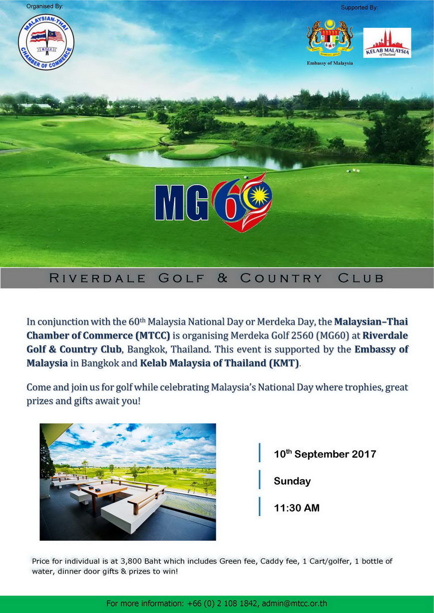 We are pleased to inform that the Malaysian-Thai Chamber of Commerce (MTCC) is organizing this year’s Merdeka Golf 2560 in conjunction with the 60th Malaysia National Day. This event is supported by the Embassy of Malaysia in Bangkok and Kelab Malaysia of Thailand (KMT).